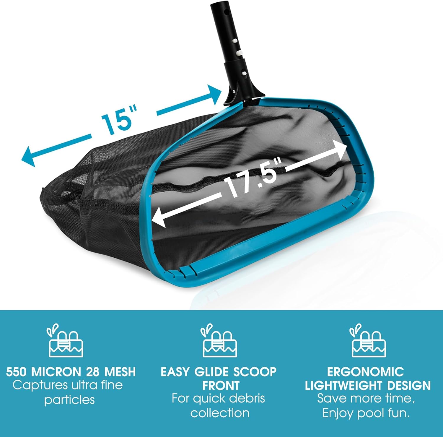 • Sturdy Aluminum Frame: The pool net skimmer frame is made of a thick layer of aluminium on the inside and a thick plastic wrapped around the outside. This allows for better load-bearing capacity, better toughness and more durable than an all-plastic outer frame. This leaf skimmer net resists degradation, maintains it’s integrity & handles big swimming pool cleaning jobs.