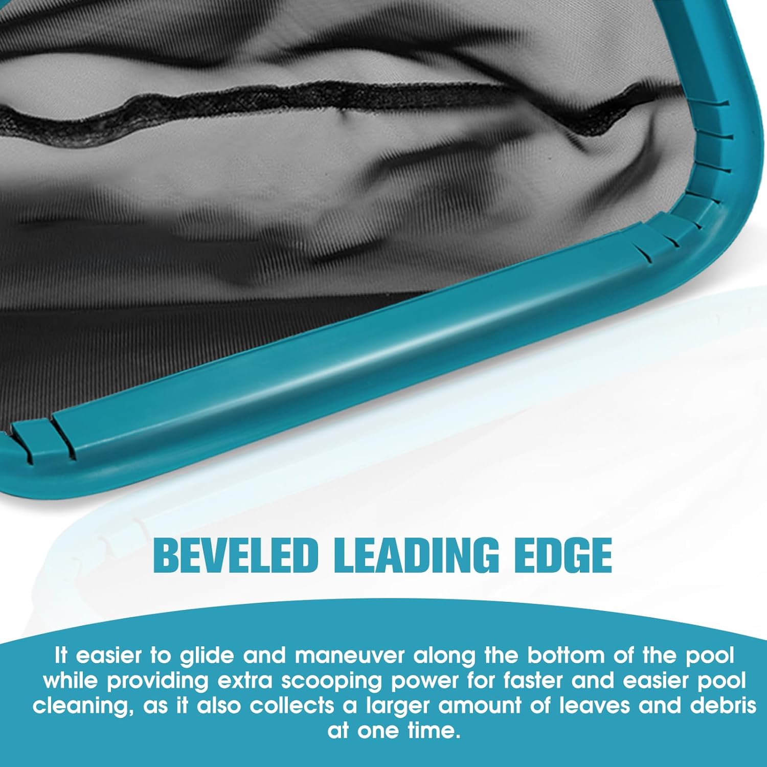 • Large Capacity: POOLWHALE swimming pool net has a 17 *9.5” opening with 14.5″ in depth. angled front lip helps scooping out debris efficiently. The wide opening makes it easy to collect larger floating stuff and to skim more impurities at once. Smooth plastic edges will not scratch the pool liner. The deep mesh pocket help accumulating more impurities without frequent dumping, saving even more effort.