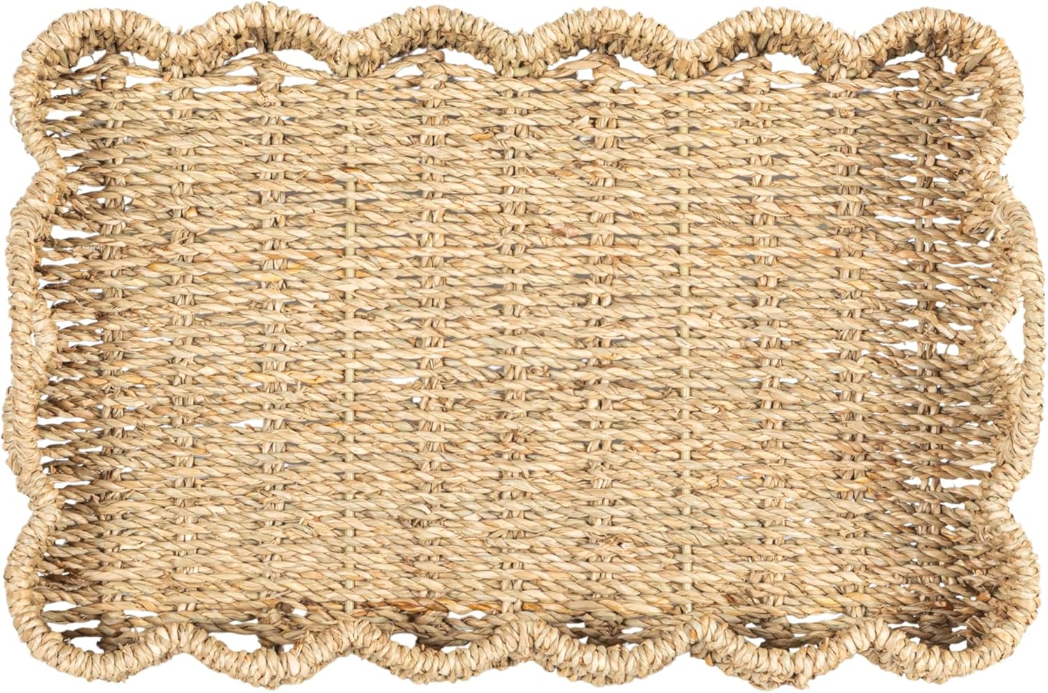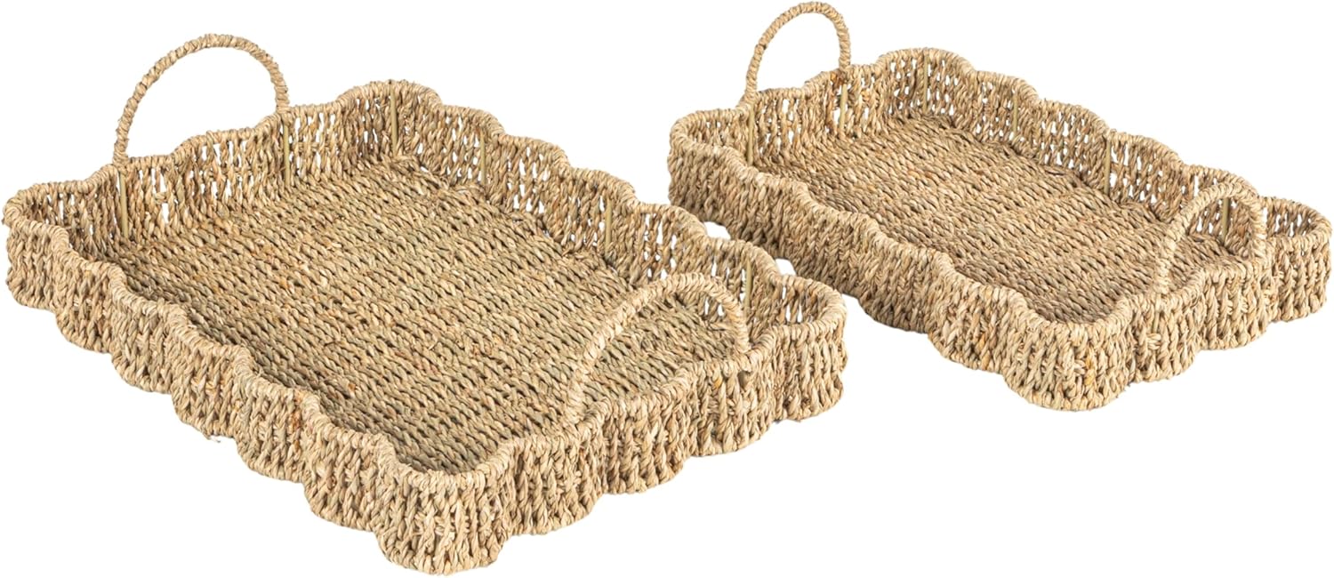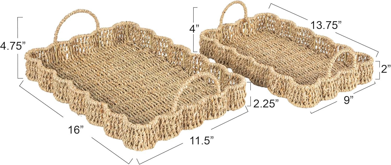 Bring a natural, earthy touch to your home with this Set of 2 Woven Seagrass Scalloped Rectangular Trays. Handcrafted from durable seagrass, these trays feature a beautifully scalloped edge and a sleek rectangular shape, perfect for versatile use. Whether used for serving, organizing, or displaying decor, these trays add a rustic yet refined element to any room. Their lightweight design and sturdy construction make them both functional and stylish, blending seamlessly into a variety of decor styles from coastal to farmhouse.