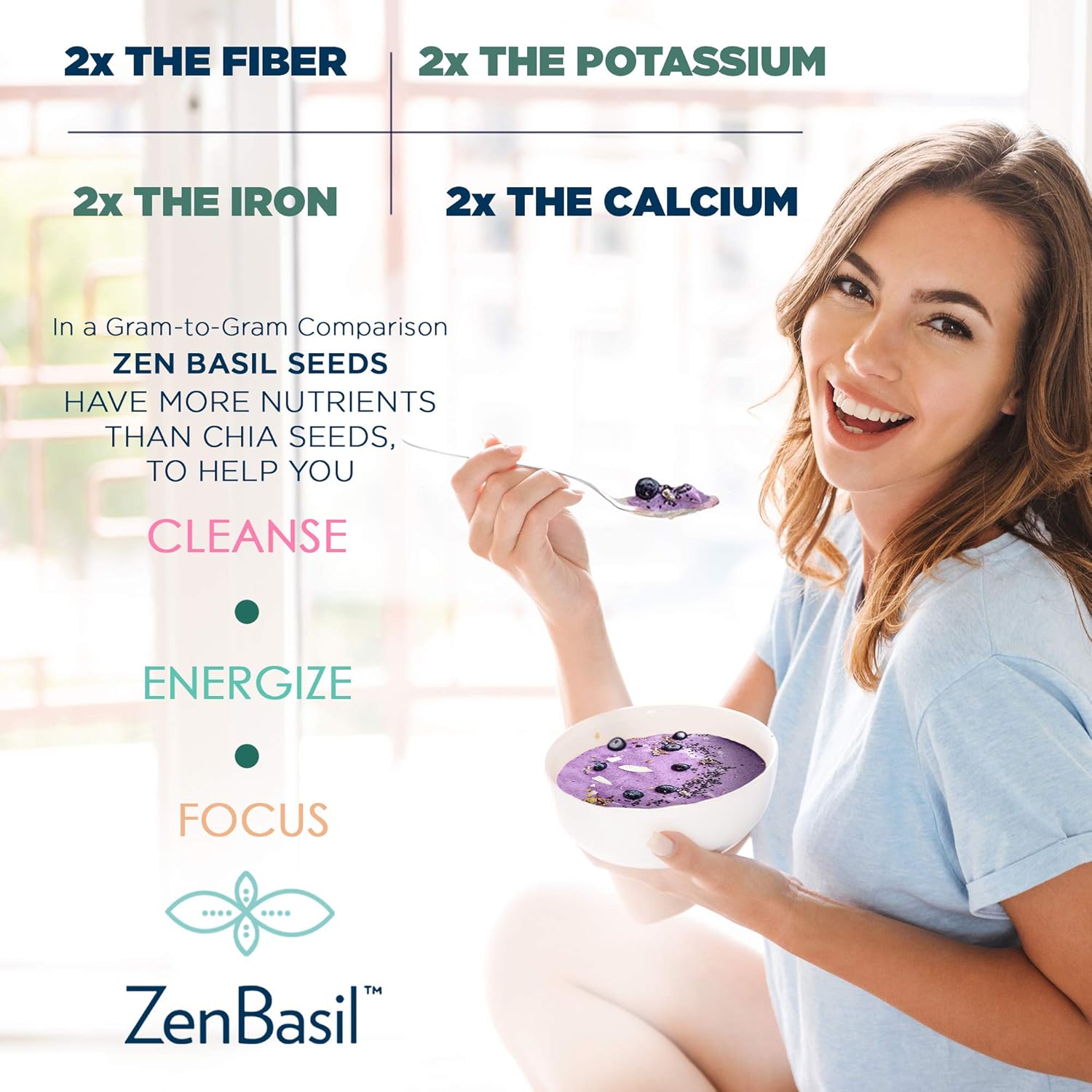 - More fiber than chia: This superfood is known for its health-promoting properties & its natural source of fiber, vitamins, electrolytes, & antioxidants. In a gram-to-gram comparison with chia seeds, Zen Basil seeds have confirmed lab results with nearly 2x more fiber, potassium, calcium, & iron! Our seeds are rich in prebiotics, polyphenols, & omega 3 & 6!